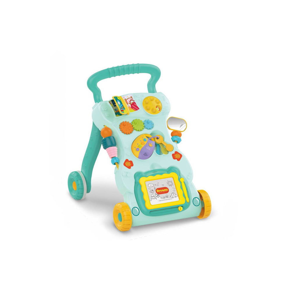 Este caminador musical para bebé incluye un panel frontal con engranajes, botones, figuras móviles, sonidos y actividades sensoriales. Además, incorpora efectos musicales que mantienen al bebé entretenido mientras fortalece su equilibrio.