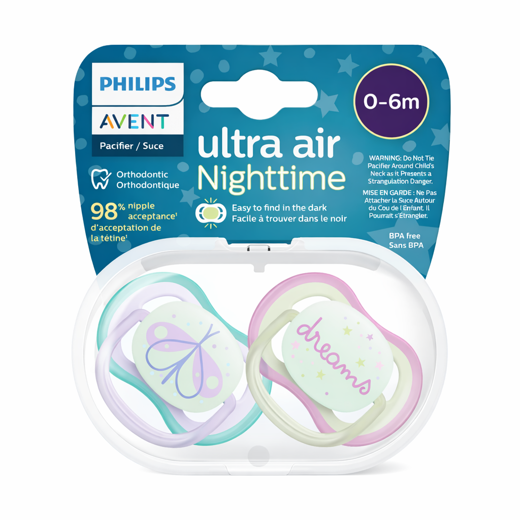 Este práctico pack x2 de chupetes Philips Avent incluye diseños suaves y delicados que además brillan en la oscuridad, lo que permite encontrarlos fácilmente durante la noche sin necesidad de encender la luz.