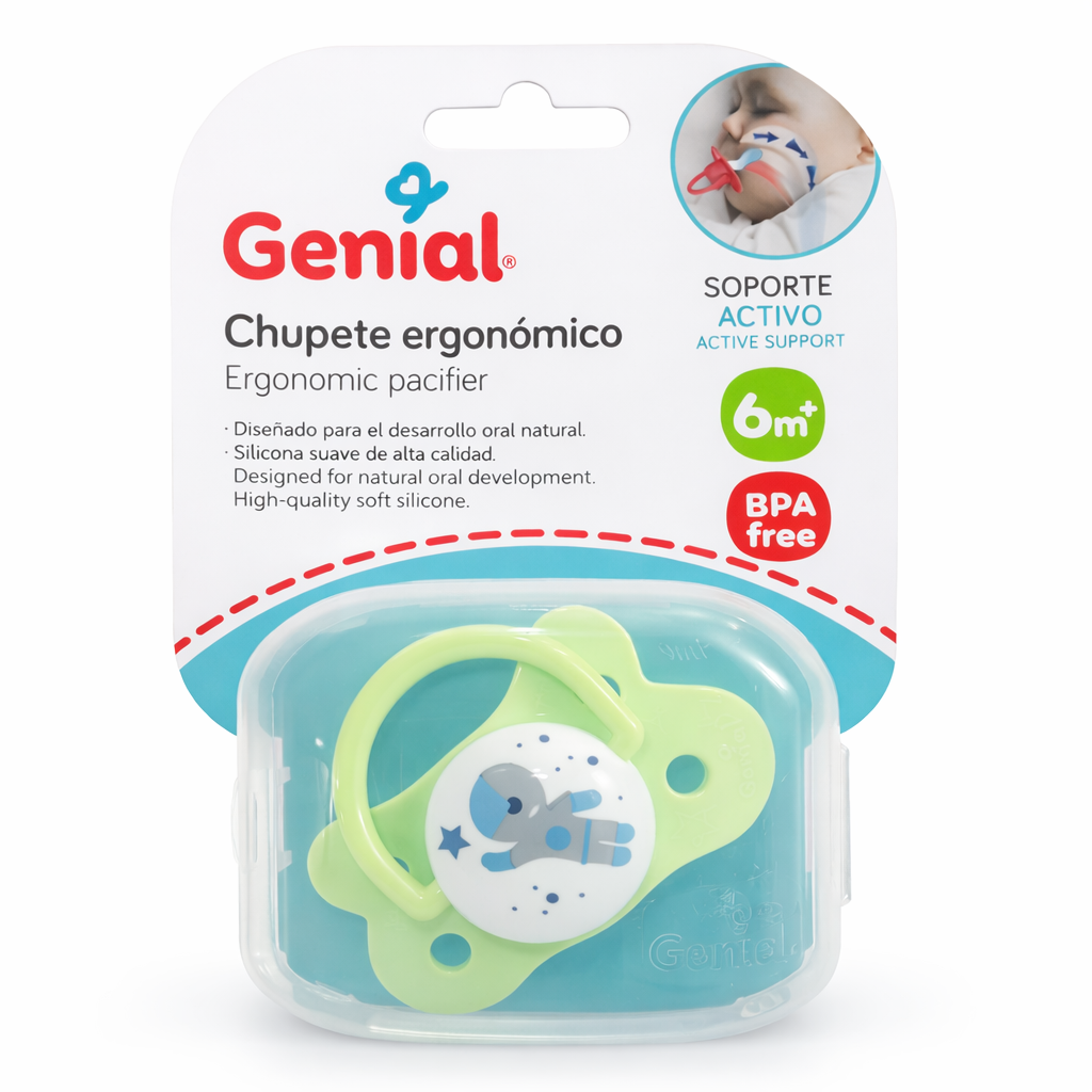 La Chupa ergonómica para bebé Genial está diseñada para brindar comodidad, seguridad y apoyo durante el desarrollo oral del bebé. Su forma anatómica se adapta naturalmente a la boca del niño, ayudando a mantener una posición adecuada durante la succión.