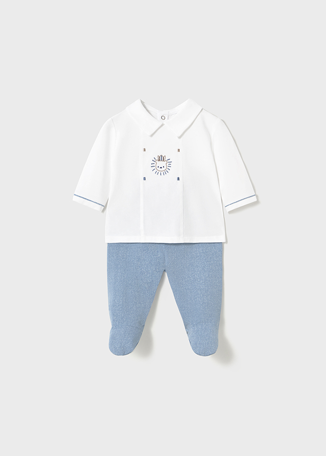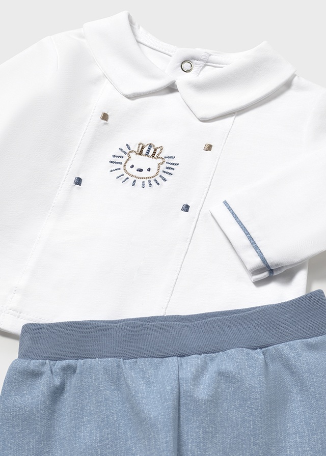 Conjunto de dos piezas para bebé compuesto por una camiseta de manga larga y pantalon a juego.