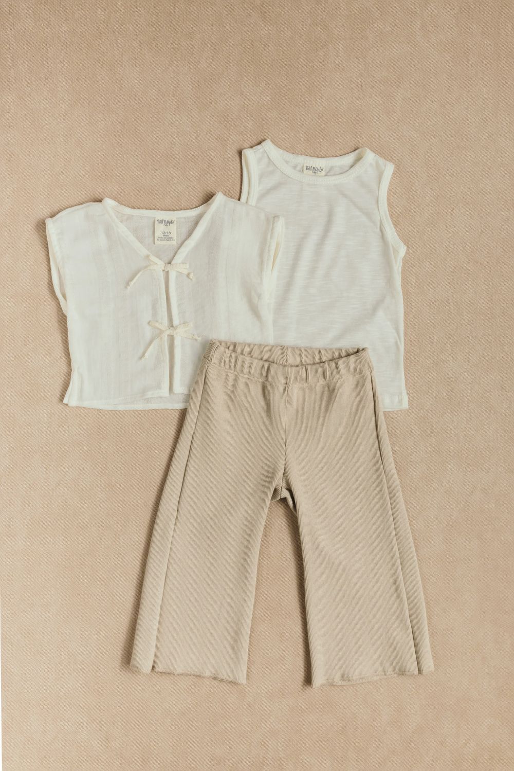 Este conjunto para niña bebé es la opción perfecta para lucir adorable y sentirte cómoda al mismo tiempo. Incluye un pantalón en ríb, que es amplio y suave, ideal para que la pequeña se mueva con libertad y esté cómoda durante todo el día. La camiseta básica es sencilla y versátil, perfecta para combinar con diferentes prendas, y está hecha con tejidos suaves que cuidan la delicada piel de la bebé. Además, el chaleco añade un toque lindo y práctico, ideal para abrigar sin perder estilo. Es un conjunto completo, cómodo y adorable, perfecto para las pequeñas que disfrutan de la comodidad sin sacrificar su ternura.