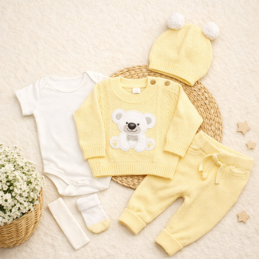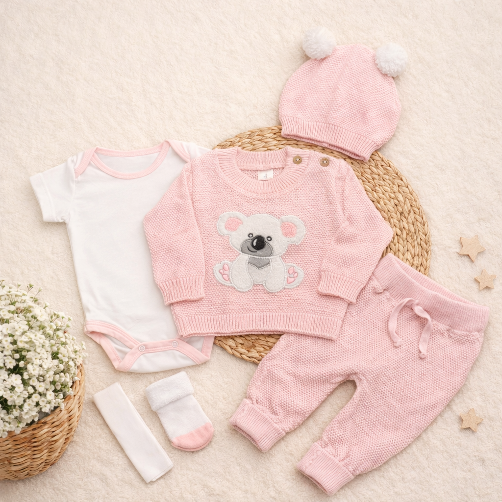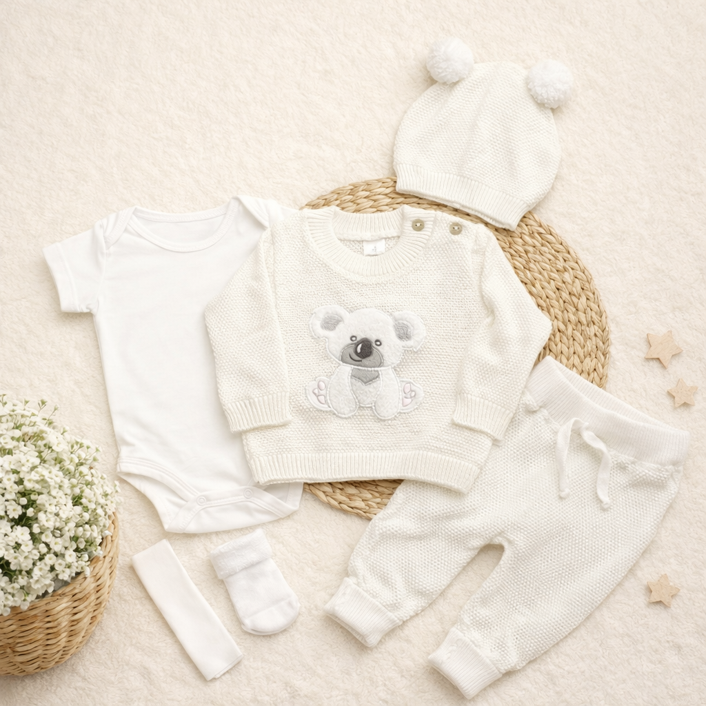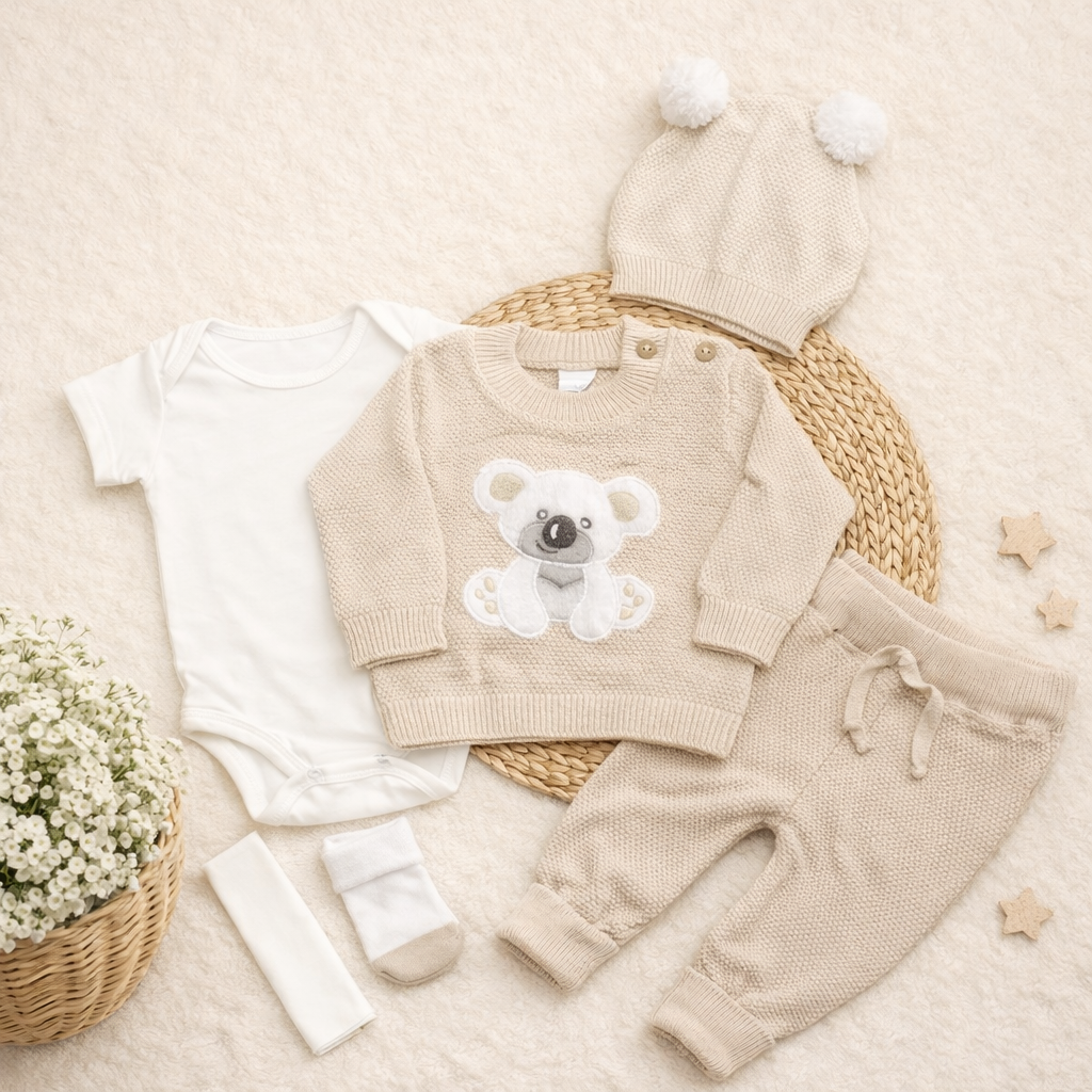 Este set recién nacido koala tejido incluye todas las prendas esenciales para vestir al bebé desde el primer día: